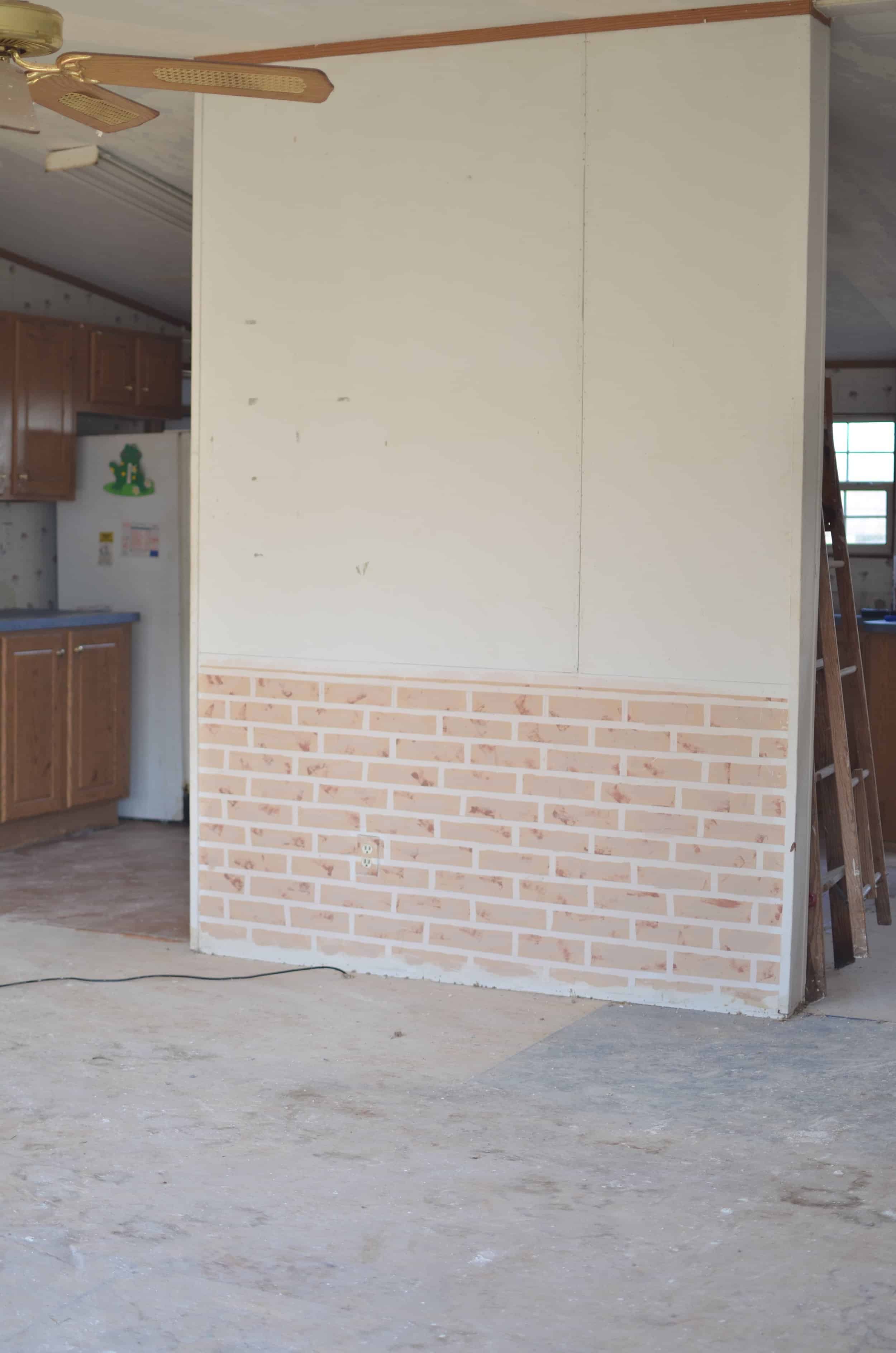 Don’t you just love that faux brick finish from the previous owners? It was one of the first things that we changed by putting up real shiplap boards.