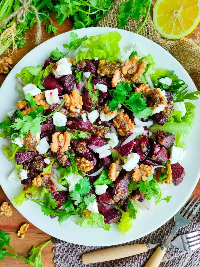 50. Beetroot Walnut Feta Salad with Roasted Garlic Dressing