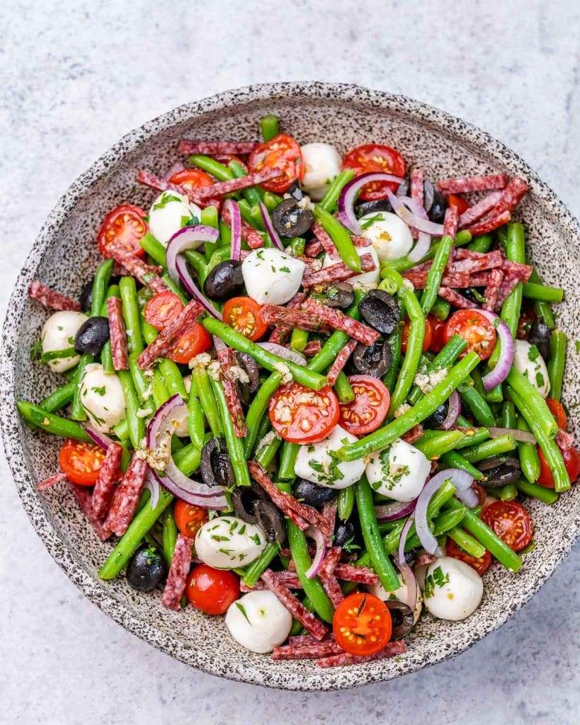 Make this simple cold green bean salad recipe. You only need fresh veggies, mozzarella cheese, and a delicious herby vinaigrette dressing to make this fresh green bean and tomato salad in under 15 minutes.