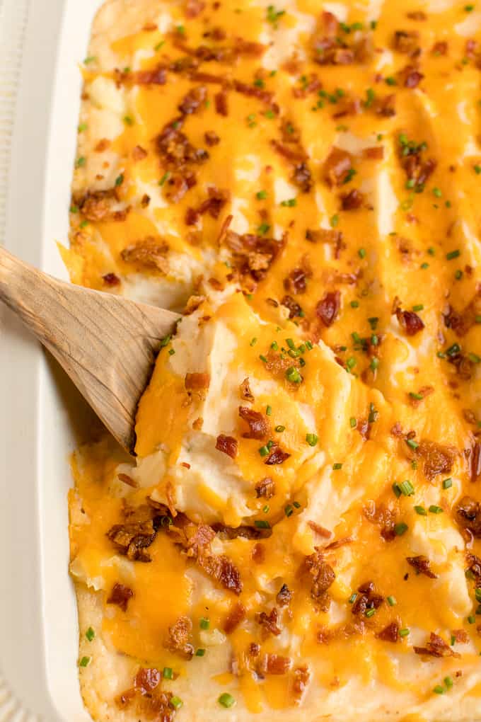 This dish is the perfect combination of creamy, fluffy, and loaded with all the best parts of a loaded baked potato, from sour cream to cream cheese and shredded cheese.