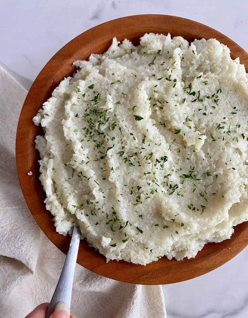 Mashed celery root, celeriac, is a low-carb alternative to mashed potatoes! With a mild, sweet, celery-like flavor, this root vegetable is a naturally healthy, keto, vegan, gluten-free, and paleo side dish when boiled and mashed with herbs and flavorings.