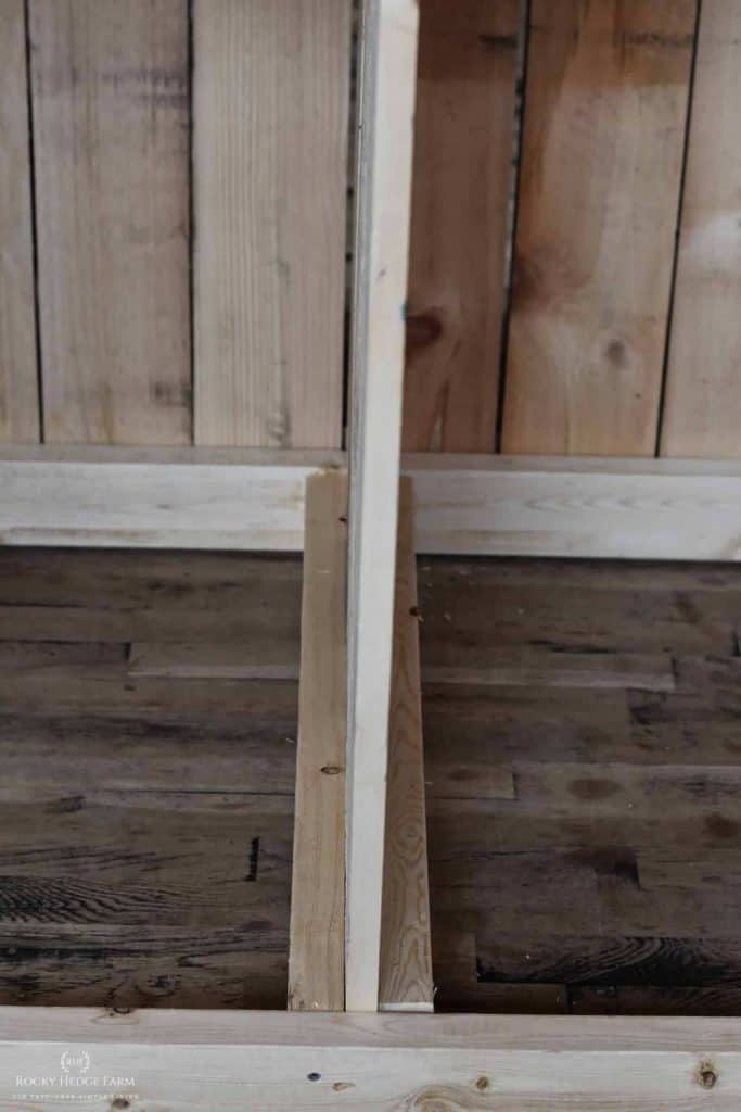 Then, add another 2×4 on either side of the middle frame walls. This is where you will attach the boards to create the middle shelf.