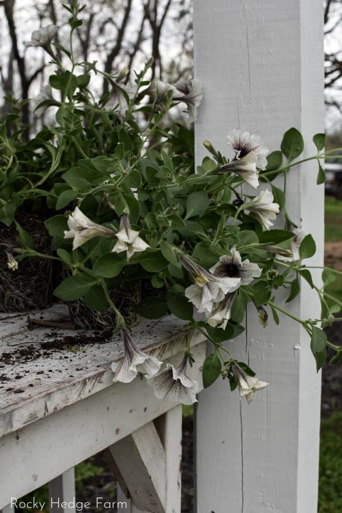 There are so many great places to hang flowering petunia baskets. The edges of a porch on the house or garden shed, deck edges, garden arbors, and even clothesline poles.