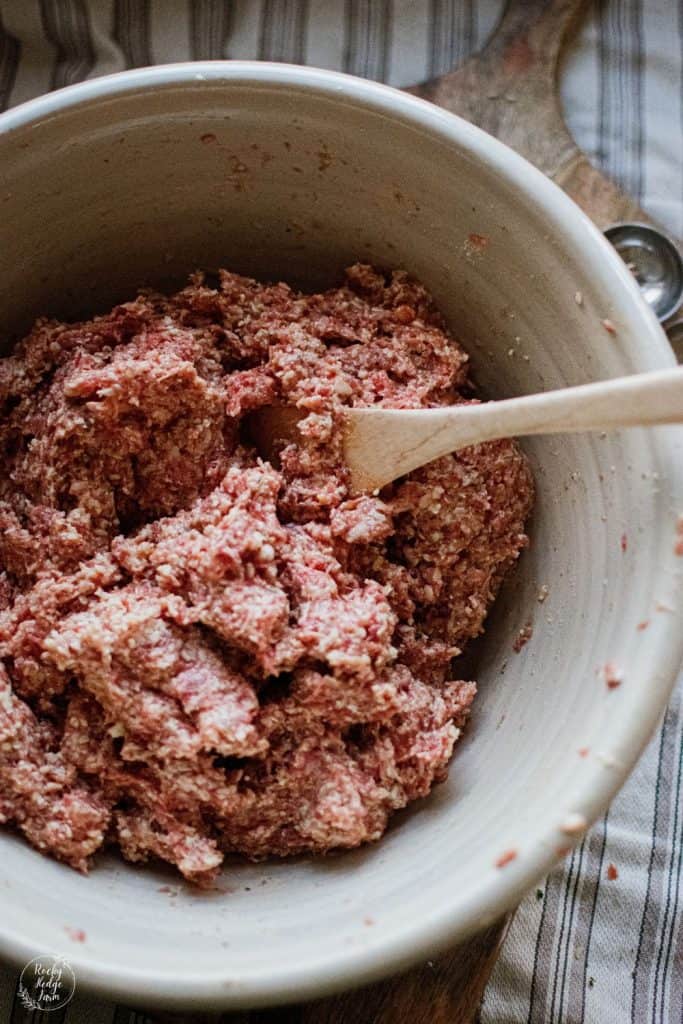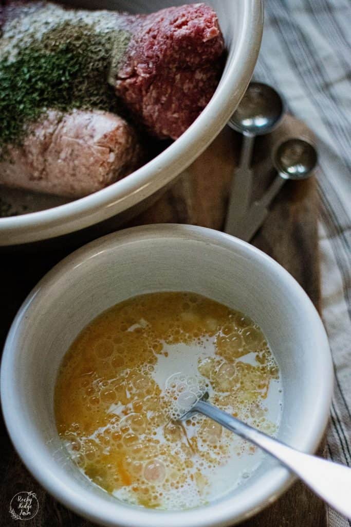 Step 1 – Mix Ingredients. Add ground meat, herbs, spice, egg, and dairy ingredients for your meatballs to a large bowl, omitting the fat that is used to brown them.