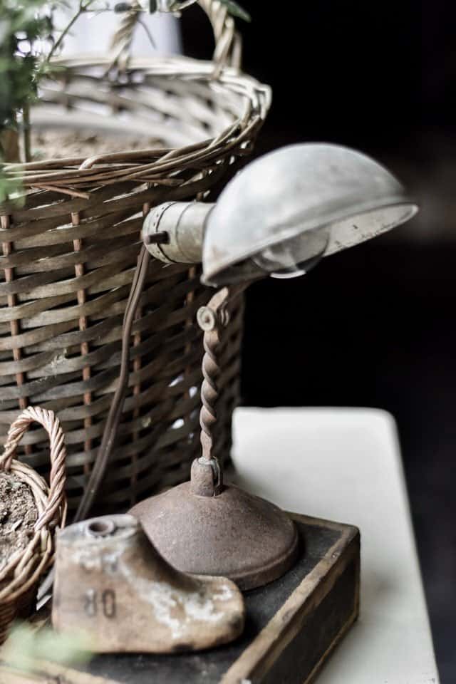 My mom also brought out a tiny wooden shoe mold with the size 0. You may remember that I also found a larger size shoe mold, and I have plans to keep both of them. Another favorite find was a small metal lamp. It is a bit rusty but unbelievably the light bulb still worked after I drug it out of all the mess in the shoe shop.