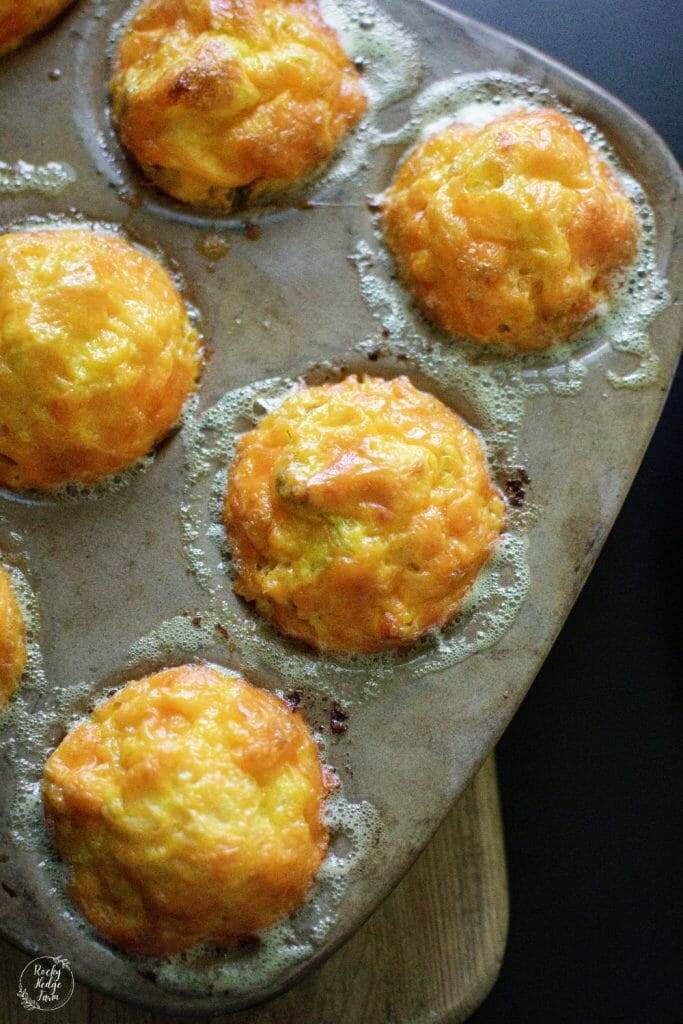 - BAKE: Place the muffin tins in your preheated oven and bake for 18-20 minutes. You’ll know they’re done when the eggs are set, and the tops are a beautiful golden brown.