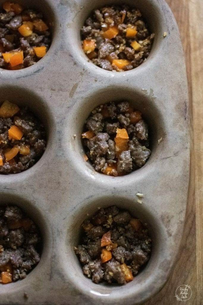 - FILL THE MUFFIN TINS: Pour egg mixture evenly over the sausage and vegetables in each muffin cup.