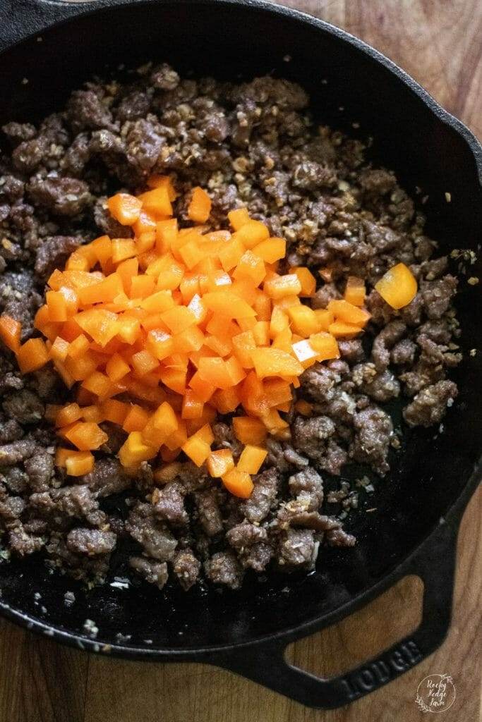 - BROWN THE SAUSAGE: Heat a large cast iron skillet over medium heat. Add the sausage and crumble it up with a wooden spoon as it browns.
