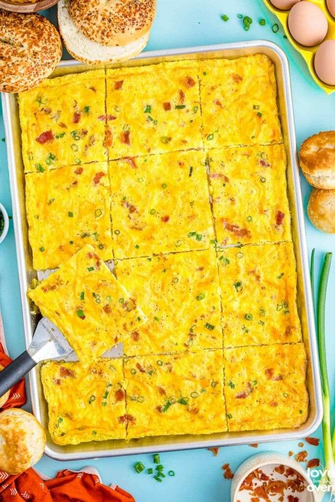 Sheet pan eggs make for the easiest breakfast using this baking hack! Instead of cooking 12 servings of eggs 12 different times, make it all at once on a sheet pan in under 30 minutes.
