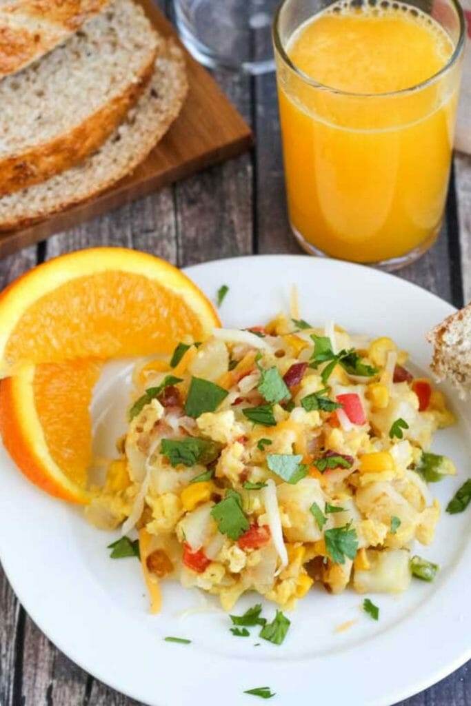 This easy skillet breakfast scramble recipe is hearty and satisfying. Filled with scrambled eggs, potatoes, peppers, onions, cheese, and bacon, it is a great dish to add to a biscuits and gravy breakfast menu.